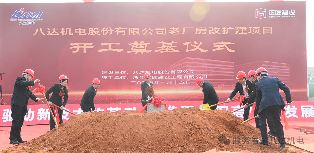 2025年1月15日,八達(dá)機(jī)電股份有限公司老廠房改擴(kuò)建項(xiàng)目開工奠基儀式在施工地隆重舉行。八達(dá)機(jī)電股份有限公司董事長兼總經(jīng)理杜左海與其他董事、高管及多位股東、員工代表,施工單位浙江正匠建設(shè)工程有限公司董事長蔡冷雙等出席儀式。