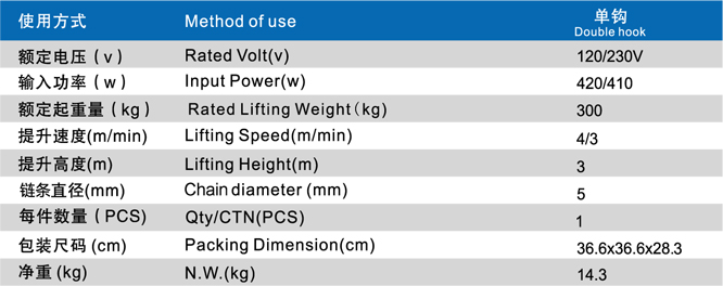 采用吊鉤懸掛式或吊環(huán)懸掛式安裝采用機(jī)械制動(dòng)和上下行程開關(guān)控制;采用高強(qiáng)度起重環(huán)鏈?zhǔn)褂脡勖L(zhǎng)采用110V、230V單相電源。