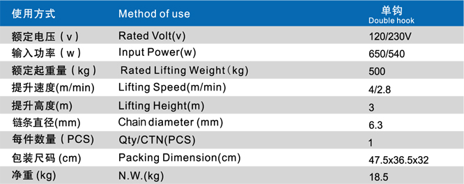 采用吊鉤懸掛式或吊環(huán)懸掛式安裝采用機械制動和上下行程開關控制;采用高強度起重環(huán)鏈使用壽命更長采用110V、230V單相電源。