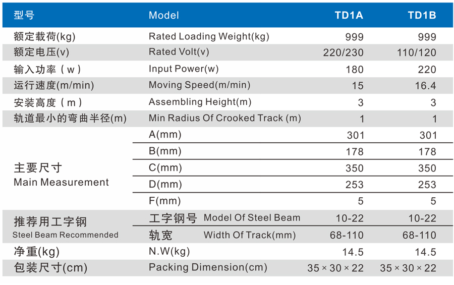 TD系列微型電動(dòng)行車以電動(dòng)機(jī)驅(qū)動(dòng),行走于工字鋼的軌道下緣處,配以電動(dòng)葫蘆或手拉葫蘆便可組成橋式、單梁或懸臂式起重機(jī)。它廣泛地使用于工廠、礦山、碼頭、倉庫、建筑工地等用于安裝機(jī)器設(shè)備,吊運(yùn)貨物的場合。